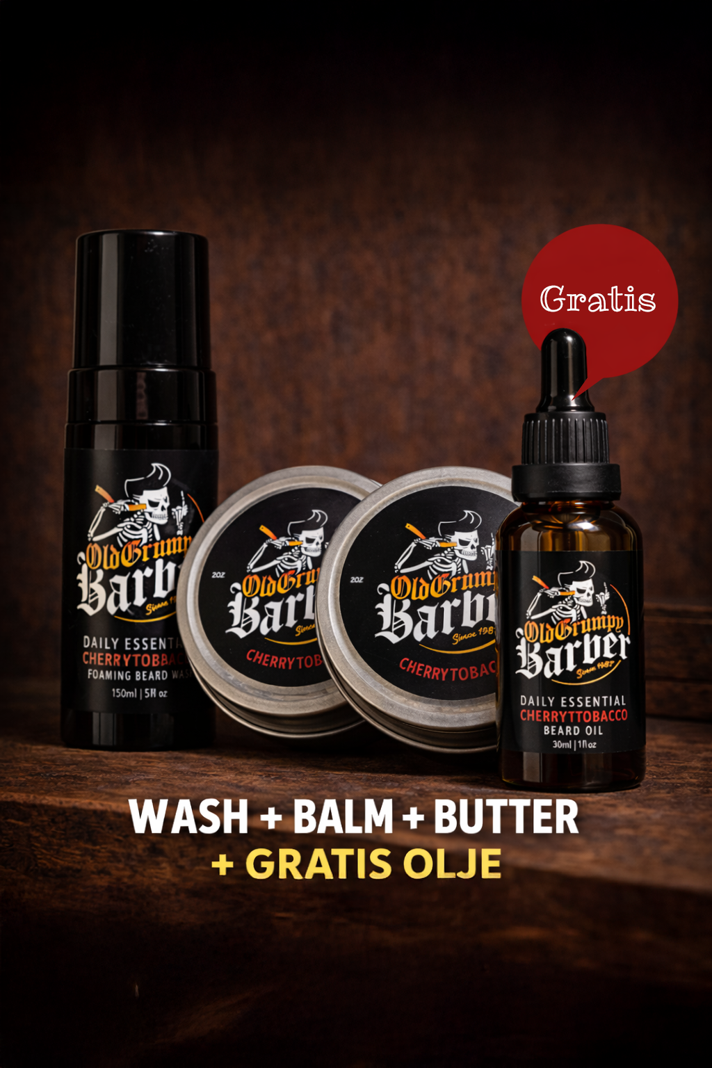 I denne pakken får du en komplett daglig rutine for skjegget: wash, balm og butter - og som en bonus får du skjeggolje helt gratis.